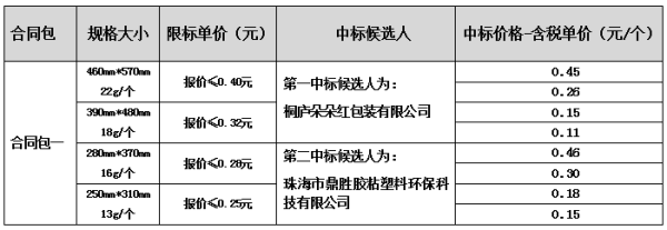 中国邮政集团有限公司浙江省分公司国内快递包裹绿色外包装袋入围采购项目公开招标,已按采购文件规定的评选方法及相关规定的要求完成评标工作,现将中标候选人公示如下: