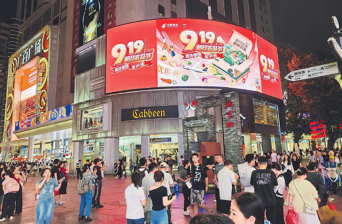 9月23日,2025年“中国农民丰收节”拉开帷幕。当天,“919”邮政农品节宣传大屏在北京、广州、深圳、武汉、长沙、南昌、哈尔滨多地繁华街区亮相,以都市核心商圈的流量势能,提升邮政农品节的品牌知名度与行业影响力。图为在广州市北京路,“919”宣传大屏闪亮夺目。