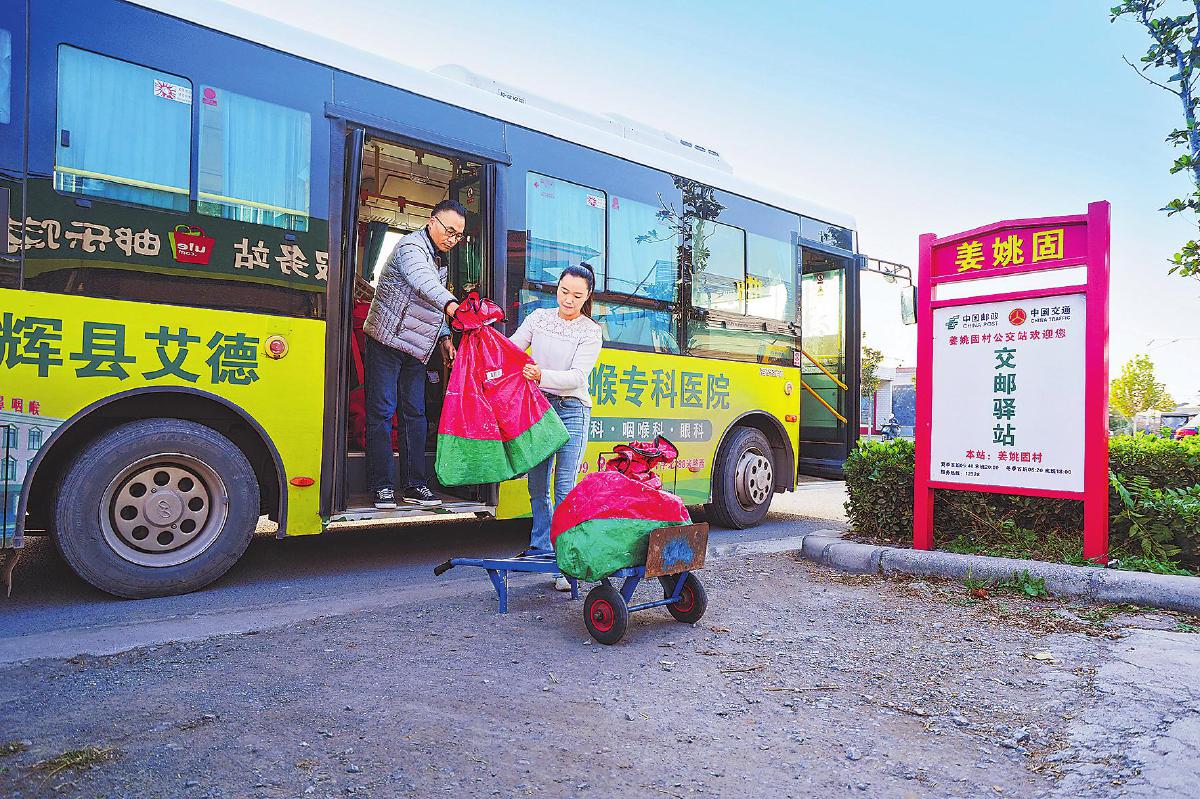 “现在每天收发包裹230多件,包括村民网购的商品,还有准备寄走的土鸡蛋、手工粉条等特色农产品。”关亚杰的百货店也是村级邮政便民服务站,她一边扫码录入信息,一边指着窗外说,“等公交车一到,待寄的包裹就能直接发往县城。”