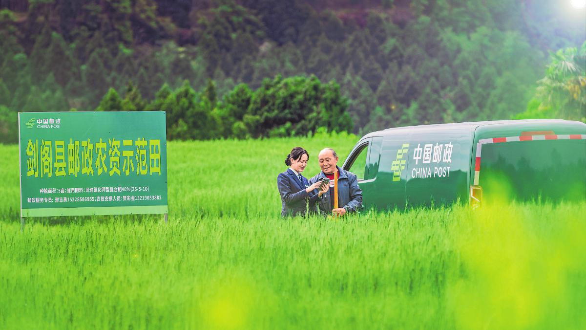 4月10日,在四川省剑阁县汉阳镇中心村示范田内,邮政工作人员为农户讲解新型复合肥的科学施用要点。□张平摄