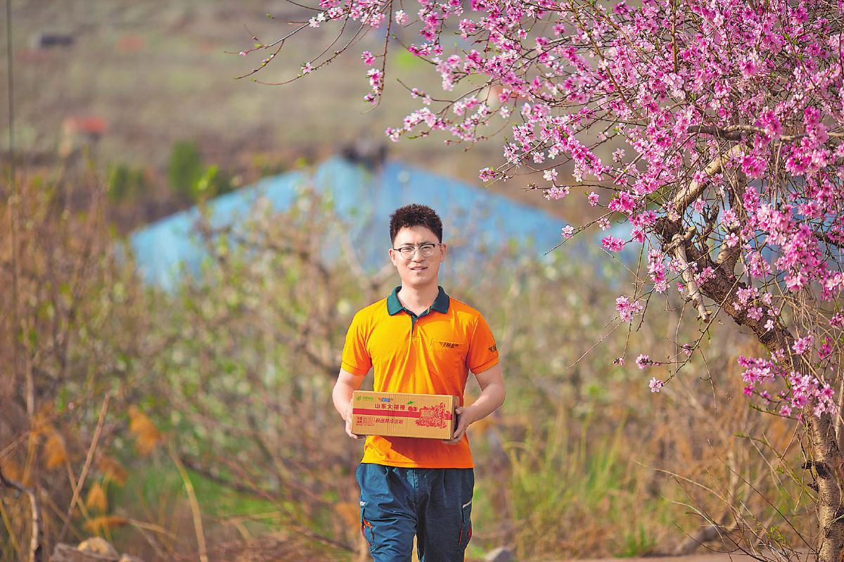 4月9日,山东省沂源县,邮政工作人员深入当地果园,为果农提供寄递服务。□周鹏摄