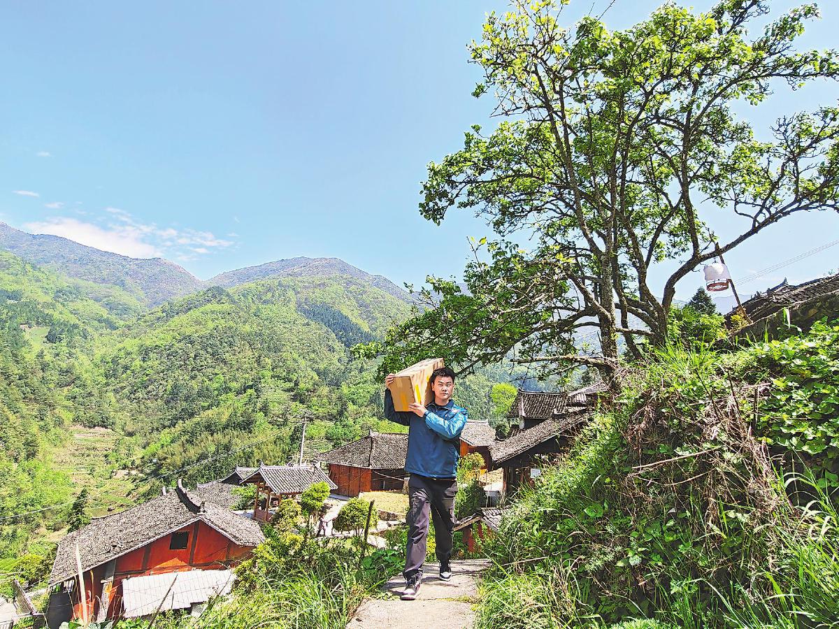 4月10日,贵州省雷山县雷公山苗岭侗寨,乡邮员上门投递包裹。□韩静桦摄