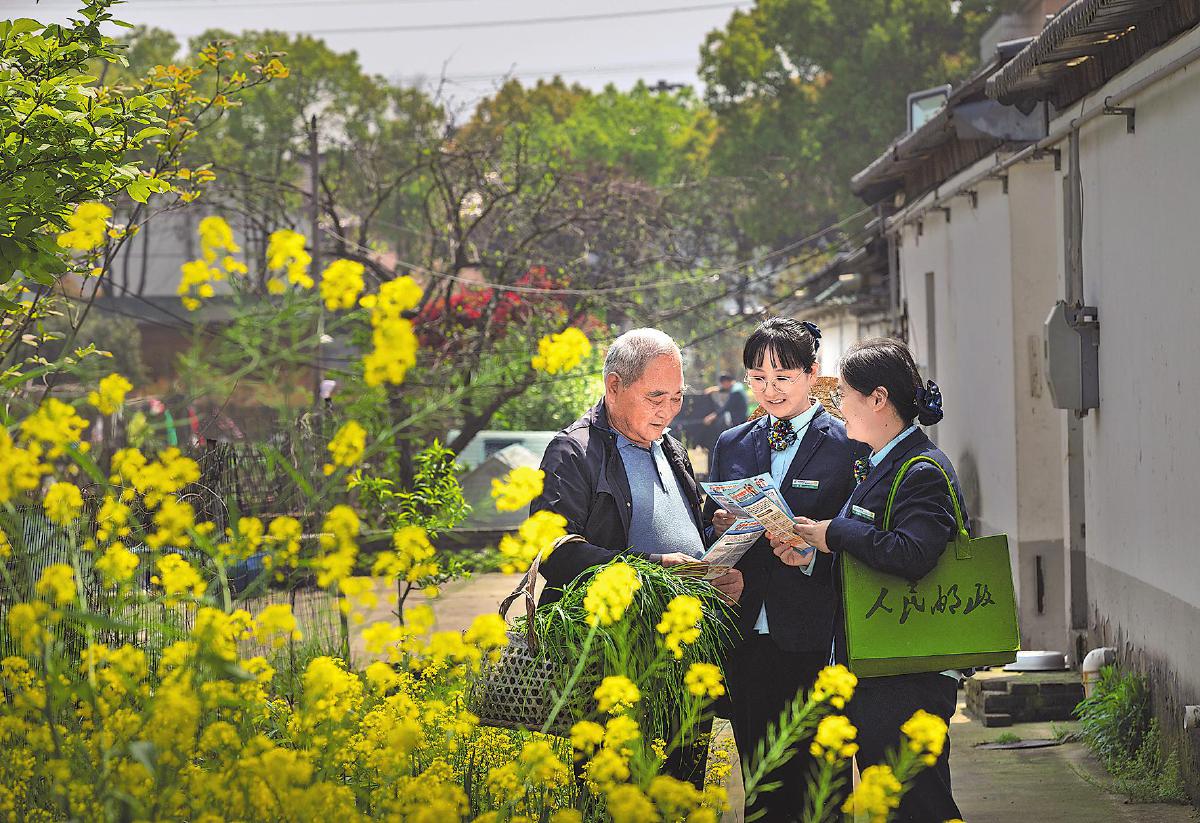 4月10日,江苏省常州市奔牛镇,邮政工作人员走进农户小院,向村民宣讲金融反诈知识。□吴敏摄