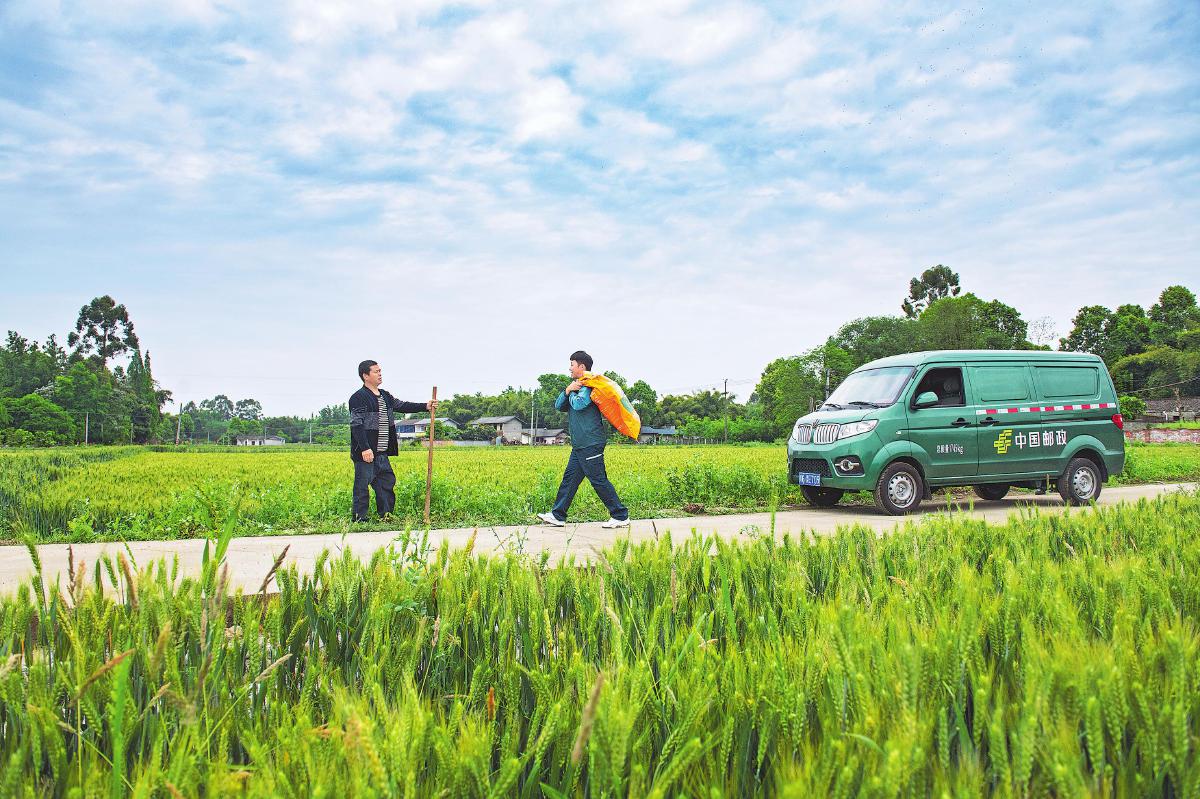 4月13日,四川省成都市新津区,邮政工作人员送肥下乡。□曾祥文摄